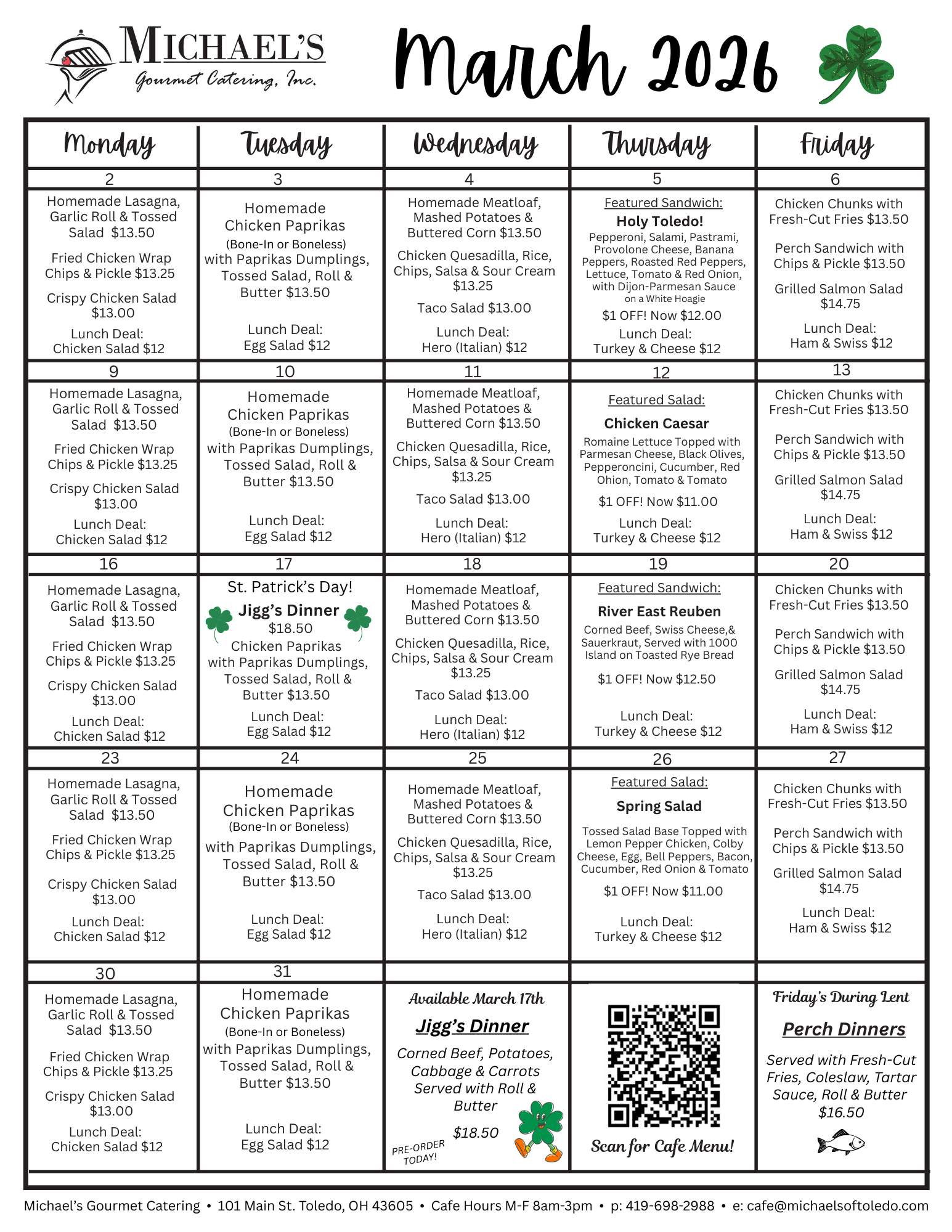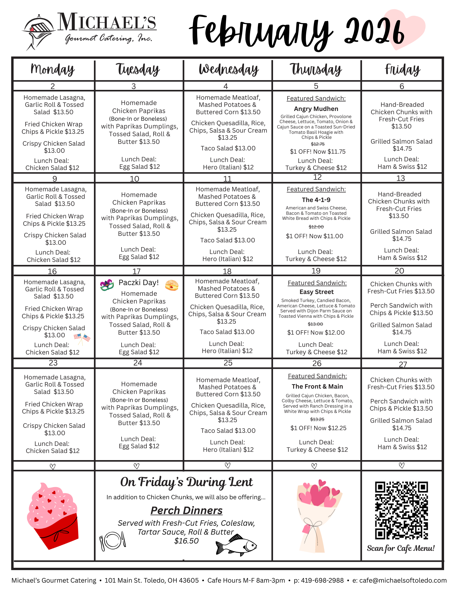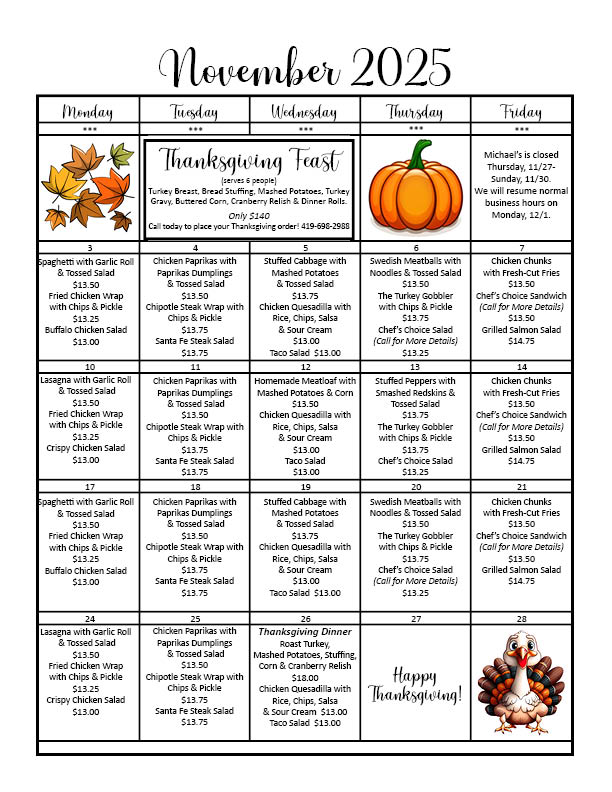 With a rotating menu of homecooked hot meals, slow-cooked soups, and sandwiches on freshly baked bread, you’ll leave nourished in more ways than one. Come get to know us at Michael’s Café & Bakery.